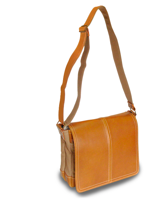 Unisex bag with reinforced laptop computer holder, magnetic snap closure, front pockets with snap closure, leather organizer, back open pocket and fixed adjustable shoulder strap.